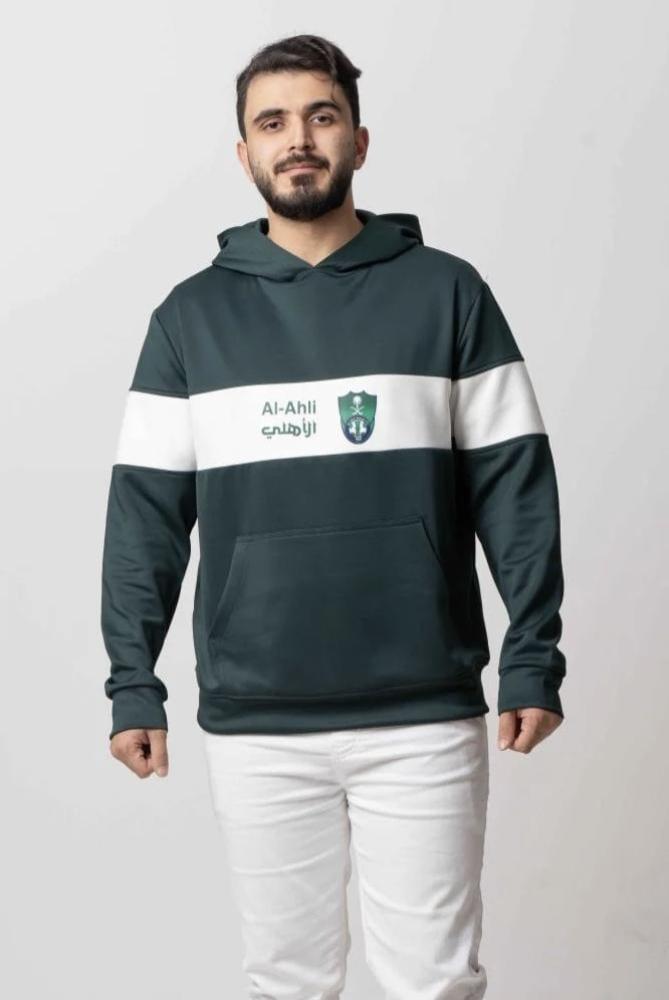 هودي أنيق وعصري باللون الأزرق مع شريط أبيض يتوسطه شعار نادي الاهلي